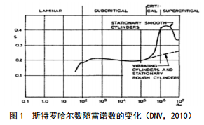 式中: fs為漩渦泄放頻率, Hz; U為波流流速,m/s; D為管道外徑, m; St為斯特羅哈爾數(shù)(Strouhalnumber),是流體雷諾數(shù)Re的函數(shù)(圖 1),對于剛性圓柱體, St一般取0.2;流體雷諾數(shù)Re=U×D /v,其 中v為運(yùn)動黏度, m2/s。