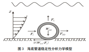 直接鋪設(shè)在海床上的管線,由于受到環(huán)境水動力載荷作用,導(dǎo)致管道產(chǎn)生豎向或側(cè)向移動。圖 3為海底管道穩(wěn)定性分析受力模型,環(huán)境載荷包括作用于管道的水動力載荷(拖曳力、升力和慣性力)、管道沉降產(chǎn)生的側(cè)阻力。