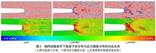 研究可知,在不存在氫原子的情況下,鐵釋放應(yīng)變能的順序?yàn)樗苄宰冃巍⑽诲e(cuò),最后才是破壞性最強(qiáng)的斷裂,而隨著氫原子的濃度升高,應(yīng)力只在納米區(qū)域內(nèi)有較大集中,氫原子的引入對(duì)相變影響不明顯,斷裂卻被極大加強(qiáng),最終當(dāng)氫原子濃度達(dá)到一定數(shù)值時(shí),斷裂變成卸載應(yīng)變能的唯一方式,而這種情況是工程中最為危險(xiǎn)的。