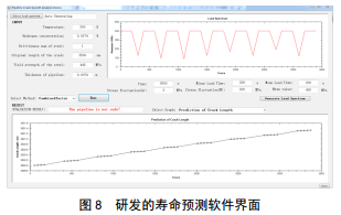 圖 8中展示了隨機(jī)生成的欠載譜圖,和計(jì)算剩余壽命前需要收集的數(shù)據(jù)。從譜圖中可以得到加載的應(yīng)力強(qiáng)度變化和加載頻率等信息。初始輸入的數(shù)據(jù)為環(huán)境溫度(實(shí)測)、基體氫濃度(滲氫電流密度實(shí)驗(yàn))、材料的脆性參數(shù)(計(jì)算擬合,屈服強(qiáng)度越高越接近1)、裂紋的原始長度(管道內(nèi)檢測)、材料屈服強(qiáng)度、管壁厚度(實(shí)測)。基于以上現(xiàn)場數(shù)據(jù)和管道內(nèi)應(yīng)力變化,預(yù)測管道中裂紋長度。