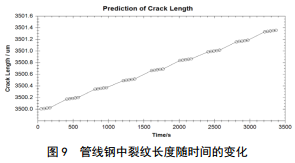 管道中的裂紋長度預(yù)測值如圖 9所示,裂紋長度預(yù)測值與管道壁厚的比值達(dá)到或者接近于三分之一, 則認(rèn)為管道接近失效斷裂。管道斷裂裂紋長度的門檻值,取決于管道原始厚度、管材、運(yùn)行溫度等因素,每種管材都需要通過實(shí)驗(yàn)確定其斷裂門檻值,用于計(jì)算剩余壽命。