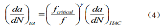 ,這一模型忽略了加載頻率等外界條件對(duì)于裂紋生長的影響[13]。疊加模型作為對(duì)Paris模型的補(bǔ)充,將加載頻率引入模型中,但是對(duì)加載頻率的作用未給出準(zhǔn)確量化,而且對(duì)于應(yīng)力腐蝕(SCC)和疲勞(fatigue)的關(guān)系也沒 有 明 確 的 解 答[ 1 4 , 1 5 ]。 聯(lián) 合 因 子 模 型 如 公 式