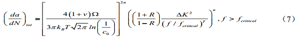 所示[15,16],是經(jīng)驗(yàn)?zāi)P椭斜容^完備且預(yù)測準(zhǔn)確性較高的模型,然而此模型忽略了 加載頻率對(duì)裂紋生長的影響存在閾值,而且此模型無法準(zhǔn)確量化外界環(huán)境,特別是溫度對(duì)于裂紋生長的影響。因此,理論模型的研發(fā)和對(duì)微觀斷裂機(jī)理的研究依然是一個(gè)科學(xué)難題。