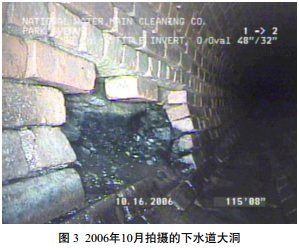 (2)燃?xì)夤艿篮椭魉艿老旅娴耐寥辣粵_刷而流失,并通過下水道上面的大洞進(jìn)入下水管道中,這個大洞長期成為雨水匯集的地方(圖 3)。