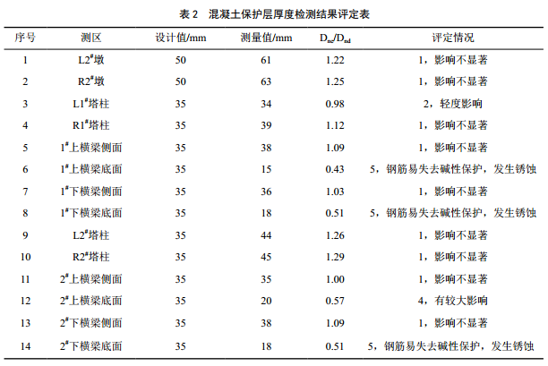 由鋼筋保護(hù)層評定檢測結(jié)果(表 2)可知,墩、塔柱、橫梁側(cè)面保護(hù)層厚度基本滿足設(shè)計(jì)要求,影響不顯著,橫梁底面保護(hù)層厚度普遍不足,保護(hù)層厚度 不足將影響結(jié)構(gòu)耐久性,隨著使用年限的增長,保護(hù)層厚度不足處將因鋼筋銹脹導(dǎo)致主梁出現(xiàn)裂縫,嚴(yán)重的發(fā)生混凝土剝落、露筋,銹蝕等病害。