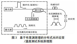 基于布里淵原理的分布式光纖應(yīng)變監(jiān)測(cè)技術(shù),近兩年有了長(zhǎng)足的發(fā)展,實(shí)際工程測(cè)量精度≤5με。BOTDA采用布里淵光時(shí)域分析技術(shù),系統(tǒng)連接兩根遠(yuǎn)端環(huán)接的單模光纖作為分布式傳感器,實(shí)現(xiàn)對(duì)被監(jiān)測(cè)對(duì)象的應(yīng)變/溫度信號(hào)實(shí)時(shí)采集和分析處理。在BOTDA傳感系統(tǒng)中,配備了一個(gè)用于測(cè)量分布式應(yīng)變和溫度的電光調(diào)制器。該技術(shù)基于布里淵散射原理(SBS),利用了光纖中的布里淵散射光頻率變化量(頻移量)與光纖軸向應(yīng)變或環(huán)境溫度之間的線性關(guān)系來實(shí)現(xiàn)傳感(圖 3)。