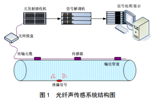 安全監(jiān)測(cè)的重點(diǎn)是在線運(yùn)行、且超設(shè)計(jì)壽命周期運(yùn)行的老舊管道。一條幾百上千公里的管線,可能只需要針對(duì)高后果區(qū)或者局部存在安全隱患的區(qū)域?qū)嵤┌踩O(jiān)測(cè)。源自軍工技術(shù)的準(zhǔn)分布式光纖聲傳感技術(shù)在這種情況下具有先天優(yōu)勢(shì),只需按照合適的間距 (幾百到幾千米)在管道沿線挖坑黏貼安裝傳感器(無需動(dòng)火、開焊),如果沿途有通信光纜,可用富余的光纖連接傳感器,也可通過無線網(wǎng)絡(luò)把采集到的信號(hào)上傳至監(jiān)控中心。無須沿著管道全線開挖敷設(shè)光纜,工程施工量較小、工期短,組網(wǎng)靈活方便,綜合性價(jià)比高。準(zhǔn)分布式光纖聲傳感系統(tǒng)結(jié)構(gòu)見圖 1。