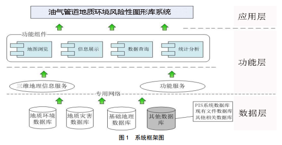 油氣管道地質(zhì)環(huán)境風(fēng)險(xiǎn)性圖形庫(kù)系統(tǒng)采用B/S+C/S的體系結(jié)構(gòu),以穩(wěn)定性和通用性為主導(dǎo),進(jìn)行分層設(shè)計(jì)與開發(fā)。為了實(shí)現(xiàn)平臺(tái)的開放性、靈活性、可擴(kuò)展性以及數(shù)據(jù)的可復(fù)用性,系統(tǒng)從邏輯上分為數(shù)據(jù)層、功能層和應(yīng)用層[5]。如圖 1所示。