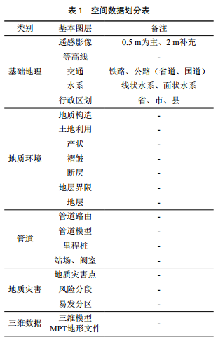 該系統(tǒng)數(shù)據(jù)類別包括空間數(shù)據(jù)、屬性數(shù)據(jù)及文件數(shù)據(jù),其中空間數(shù)據(jù)分為基礎(chǔ)地理要素、地質(zhì)環(huán)境要素、管道要素、地質(zhì)災(zāi)害要素和三維模型五大類。屬性數(shù)據(jù)分為系統(tǒng)元數(shù)據(jù)、空間矢量數(shù)據(jù)屬性、文件數(shù)據(jù)關(guān)聯(lián)數(shù)據(jù)三大類,每類數(shù)據(jù)中又對(duì)應(yīng)多個(gè)屬性數(shù)據(jù)。文件數(shù)據(jù)分為現(xiàn)場(chǎng)照片、 CAD剖面圖、野外調(diào)查表EXCEL、音視頻文件、災(zāi)害治理相關(guān)文檔及其他以文件方式存儲(chǔ)的數(shù)據(jù)。空間數(shù)據(jù)的構(gòu)成見表 1。