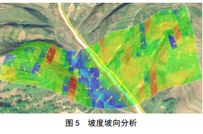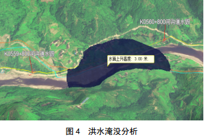 系統(tǒng)通過(guò)與用戶的交互,實(shí)現(xiàn)對(duì)三維場(chǎng)景中的任意范圍內(nèi)坡度坡向進(jìn)行分析,得出該范圍內(nèi)的坡度坡向圖,同時(shí)提供單點(diǎn)的坡度坡向信息查詢。淹沒分析功能實(shí)現(xiàn)顯示洪水淹沒面積范圍,可以清楚地確定洪水威脅的地方,對(duì)于高程低的地方可以劃為危險(xiǎn)區(qū)域,無(wú)論對(duì)防災(zāi)減災(zāi)還是災(zāi)后處理都有重要參考價(jià)值。見圖 4、圖 5。