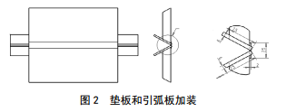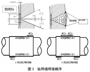 焊接前必須在縱焊縫兩側墊板上加裝引弧板,加裝方法見圖 2。兩道縱焊縫同時進行預熱及焊接,焊接方向見圖 3。預熱溫度要求100 ℃以上,根焊、熱焊后自然冷卻,進行干式磁粉檢測;填充50%后焊接退火焊道,自然冷卻,第二次干式磁粉檢測;縱焊縫填充蓋面最后焊接回火焊道,自然冷卻后濕式磁粉、超聲、相控陣檢測。焊接過程中所有焊道接頭要錯開。