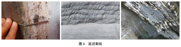 延遲裂紋(圖 6)主要來自三大因素:一是氫的存在,二是應力存在,三是有氫致開裂傾向的焊接組織,典型特點是硬度過高,原因是碳當量過高、冷速太快。