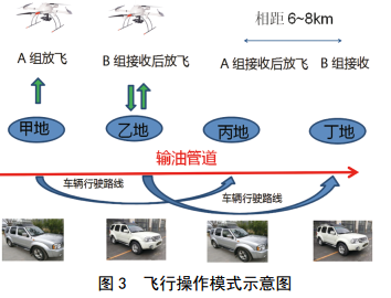 無人機巡檢作業(yè)可分為采集管道坐標及選取起降位置、繪制航線、現(xiàn)場飛行、成果分析四個步驟(圖2)。油氣長輸管道為線性工程,需確保飛行連貫性。現(xiàn)場飛行時,需組織A、 B兩組人員和車輛,使用2臺遙控器,采用“車輪戰(zhàn)”操作模式。即: B組人員提前到達乙點, A組人員從甲點使用手動模式放飛,切入航線飛行模式后趕到丙點; B組人員在乙點等待飛機到達乙點后B組切換為手動模式降落,更換電池后放飛,切入航線模式,驅(qū)車趕往丁地。周而復始,直至飛行任務完成(圖 3)。