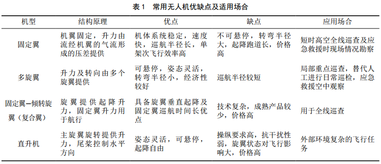 管道行業(yè)常用無人機主要有固定翼、多旋翼、固定翼―傾轉(zhuǎn)旋翼(復合翼)無人機及無人直升機4類,實物見圖 1。其結(jié)構原理、優(yōu)缺點及應用場合如表 1所示,其中多旋翼無人機應用較為廣泛。