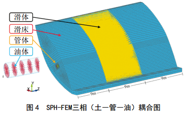 為避免滑坡作用下滑坡體及管內(nèi)輸送介質(zhì)發(fā)生大形變而致使計(jì)算終止,采用光滑粒子流體動(dòng)力學(xué)法(SPH),將問(wèn)題域離散成一系列不依賴于網(wǎng)格的粒子;針對(duì)滑床及管體小變形區(qū)域,采用傳統(tǒng)的更具效率的有限元法(FEM),并在其交界面處通過(guò)設(shè)置接觸形式,實(shí)現(xiàn)SPH-FEM算法的耦合,最大限度發(fā)揮兩者優(yōu)勢(shì),實(shí)現(xiàn)滑坡下土―管―介質(zhì)多物理場(chǎng)完全耦合建模(圖 4)。考慮模型整體重力,并與時(shí)間相關(guān)聯(lián),最大程度復(fù)原滑坡演變過(guò)程,并獲取不同時(shí)刻下管體應(yīng)力/應(yīng)變及位移情況,為管體防護(hù)工作提供理論支撐與技術(shù)指導(dǎo)。
