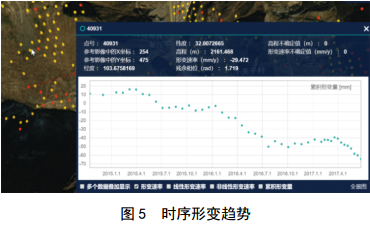 (2)基于InSAR的地質(zhì)災(zāi)害監(jiān)控關(guān)鍵技術(shù)。采用衛(wèi)星遙感監(jiān)測(cè)技術(shù)(InSAR)對(duì)成彭管道災(zāi)害多發(fā)的管段進(jìn)行監(jiān)測(cè)。通過(guò)InSAR廣域處理,對(duì)管道全區(qū)域進(jìn)行普查,實(shí)現(xiàn)對(duì)隱患點(diǎn)變化趨勢(shì)的動(dòng)態(tài)跟蹤;并通過(guò)每12天一次的時(shí)序變形監(jiān)測(cè)分析,對(duì)有緩慢形變的區(qū)域及時(shí)分析和預(yù)警,對(duì)已變形的災(zāi)害區(qū)域二次預(yù) 警和防范。專題數(shù)據(jù)包括所有形變點(diǎn)云的經(jīng)緯度位置信息,形變速率,內(nèi)檢驗(yàn)經(jīng)度信息,每一時(shí)刻形變量信息。專題圖表包括管線區(qū)域的形變速率、時(shí)序形變趨勢(shì)、累積形變量、形變面積、沉降區(qū)域的邊界等信息(圖 5)。