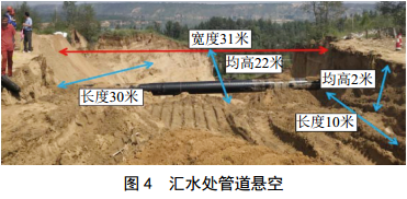 某管段由于受雨水長期沖刷,於土壩積水嚴(yán)重被沖塌,露出管道。治理措施如下。