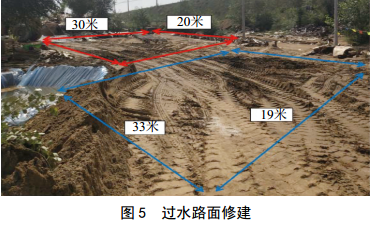 (4)排水渠前方地面使用素混凝土硬化,形成過水面,過水面正面及左側(cè)使用1.5 m齒墻保護(hù)(圖 5)。