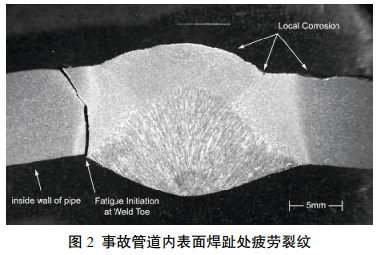 據(jù)資料記載, Enbridge在1974年、 1979年、 1982年、 1986年、 1989年和1991年均發(fā)生了管道縱向焊縫失效事故,管道都由美國鋼鐵公司生產(chǎn)。經(jīng)金相分析認定,破裂原因為焊趾處發(fā)生疲勞裂紋擴展導(dǎo)致失效。 Enbridge管徑863.6 mm管道系統(tǒng)還使用了A.O.Smith公司閃焊管道、加拿大Phoenix公司電阻焊管道、 Kaiser Steel公司埋弧焊管道,而所有由疲勞裂紋引起的縱向焊縫失效管道都產(chǎn)自美國鋼鐵公司。