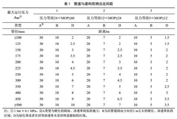 答: SNAM公司管道完整性管理中沒有高后果區(qū)的概念,在通過建構(gòu)筑物和特定場所等人員密集場所時根據(jù)《Regola Tecnica Perla Progettazione,Costruzione,Collaudo,Esercizio E Sorveglianza Delle Opere E DegliImplianti Di Trasporto Del Gas Naturale Con Densita Non Superiore A 0,8》法規(guī)的規(guī)定設(shè)置一定的安全距離,其設(shè)置距離的原則與管徑和壓力有關(guān)。在管道建設(shè)期通過土地所有人的土地時采用簽訂合同的方式明確管道路由的主權(quán),一般簽訂周期為30年。管道與建構(gòu)筑物的法定間距如表 1所示。