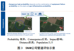答: 高后果區(qū)是管段的概念,針對周邊建構(gòu)筑物分段采取防護(hù)措施。 SNAM公司更傾向于針對具體的點采取措施,在管道管理模式上包含了高后果區(qū),并且做得更加細(xì)致。 SNAM公司在考慮后果影響因素的時候,都是針對具體的建構(gòu)筑物來評估的,而不是一段高后果區(qū),見圖 3。