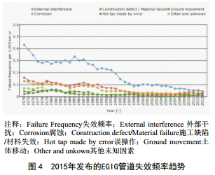 答 : S N A M 公 司 是 歐 洲 天 然 氣 事 故 組 織(EGIG)的成員,該組織定期發(fā)布報告,從報告上看,各種因素的事故率是逐步下降的,并趨于較低的合理失效頻率范圍內(nèi)。圖 4是EGIG 2015年發(fā)布的各種影響因素導(dǎo)致的失效頻率。