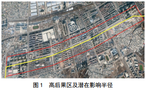 通過實地調(diào)研,該管段約4 km敷設(shè)在人行道下方,管道兩側(cè)200 m范圍內(nèi)樓房、人口密集,住戶約11 000多戶、二級甲等綜合醫(yī)院1家、學(xué)校1所(約1 800名學(xué)生)、小規(guī)模幼兒園2所、雜貨市場1個、辦公大樓多幢,總?cè)丝诩s35 000~45 000人。根據(jù)GB 50251―2014《輸氣管道工程設(shè)計規(guī)范》的規(guī)定,該管段地區(qū)等級在設(shè)計施工階段因周邊建構(gòu)筑物和人員較少,定為二級地區(qū),現(xiàn)已升為四級地區(qū)。同時,根據(jù)GB 32167―2015《油氣輸送管道完整性管理規(guī)范》規(guī)定,將該管段評定為III級高后果區(qū)管段,其潛在影響半徑為管道兩側(cè)200 m,如圖 1所示。