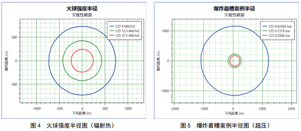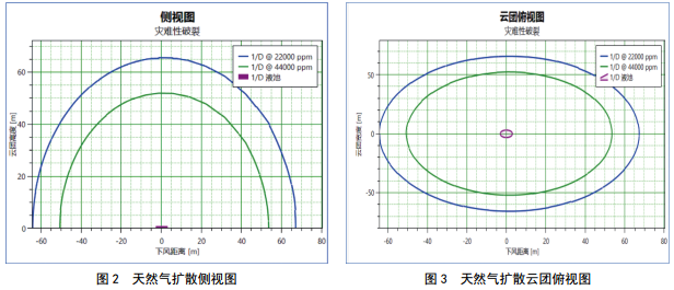 管線輸送介質(zhì)為易燃、易爆的天然氣,發(fā)生火災(zāi)爆炸事故時產(chǎn)生的沖擊波將對人員、財產(chǎn)、建筑物及大氣環(huán)境產(chǎn)生一定影響。利用PHAST軟件,對可能發(fā)生的泄漏和可能產(chǎn)生的事故進行定量分析。以管道完全破裂下的天然氣擴散、爆炸輻射熱半徑和超壓強度半徑進行分析,如圖2-5所示。