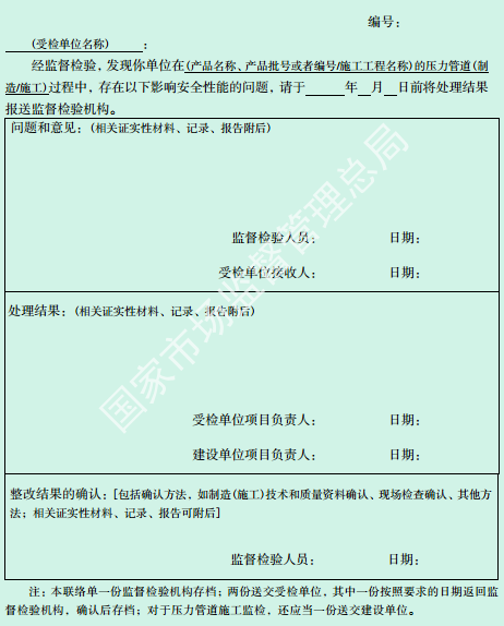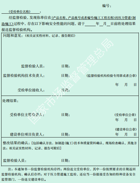 監(jiān)檢人員在監(jiān)檢過(guò)程中發(fā)現(xiàn)嚴(yán)重問(wèn)題(注 2-1),以及現(xiàn)場(chǎng)實(shí)施操作的焊接作業(yè)人員、無(wú)損檢測(cè)人員資格不符合要求時(shí),應(yīng)當(dāng)及時(shí)報(bào)告監(jiān)檢機(jī)構(gòu),由監(jiān)檢機(jī)構(gòu)向受檢單位發(fā)出《特種設(shè)備監(jiān)督檢驗(yàn)意見(jiàn)通知書(shū)(2)》 [以下簡(jiǎn)稱監(jiān)檢意見(jiàn)書(shū)(2),見(jiàn)附件 F]。對(duì)壓力管道施工監(jiān)檢還應(yīng)當(dāng)同時(shí)報(bào)告接受告知的特種設(shè)備安全監(jiān)管部門(mén),并且書(shū)面告知建設(shè)單位。