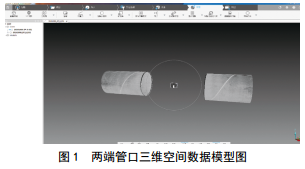 三維激光掃描技術又稱“實景復制技術”,即通過對物體空間外形和輪廓進行激光掃描,快速、大范圍采集得到物體表面的點云數(shù)據(jù)(即空間三維坐標數(shù)據(jù)),并利用相關軟件建立物體的實景三維模型[4]。采用激光測量,以主動非接觸方式快速獲取目標表面的三維空間坐標數(shù)據(jù),反映目標實時現(xiàn)狀;數(shù)據(jù)量大,點位精度高[5]。用FARO高速三維激光掃描儀掃描換管作業(yè)兩端管口,基于相位偏移技術,掃描儀持續(xù)向外投射不同波長的紅外光,接觸到對象后反射回到掃描儀,通過測量紅外線光波的相位偏移,即可準確判斷掃描儀到對象的距離。使用角度編碼器測量FARO激光掃描儀的鏡像旋轉和水平旋轉,計算各點的X、 Y、 Z坐標。用掃描儀SCENE軟件過濾處理兩端管口的三維空間數(shù)據(jù)模型見圖 1。
