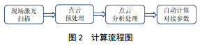 計算流程見圖 2,計算步驟包括:①現(xiàn)場激光掃描管道,獲取管道及管口點云數(shù)據(jù);②利用SCENE 軟件對點云數(shù)據(jù)進行預處理,包括濾波、剪裁;③計算軟件對預處理后的點云數(shù)據(jù)進行處理分析,特征識別,優(yōu)化擬合;④獲取管道及管口下料參數(shù)數(shù)據(jù)。