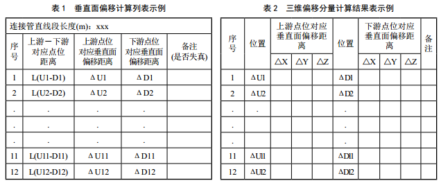 大口徑管道直管段更換作業(yè)計算過程示意見圖 3,定義兩個端面分別為上游端面(U)和下游端面(D),從端面的最高點起,按順時針方向將圓周等分為12份,對應的點位分別為U1、 U2、 U3…U12和D1、 D2、 D3…D12。 軟件自動計算各位置的距離和偏移量,以表1形式展示。三維坐標軸上的各個偏移分量計算結果如表 2示例。