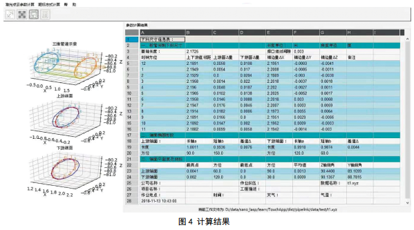 現(xiàn)場掃描耗時2分30秒,掃描完成后, SCENE軟件對數(shù)據(jù)預處理,用時6分30秒。計算軟件讀取掃描數(shù)據(jù)后,一鍵完成分析、提取、計算、建模和展示,自動采點測量建模和數(shù)據(jù)處理用時2分鐘,計算結果見圖 4。完成以上各步驟總時長為14分鐘,相比人工測量計算縮短了大量時間。