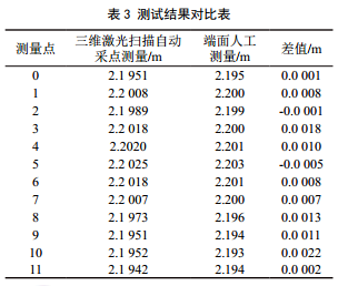 隨后組織 經(jīng) 驗 豐 富 的 管 工 、 焊 工 和 技 術 員 人工實測,測量結果對比見表 3。可以看 出 , 三 維激 光 掃 描 自 動 采 集 測 量 計 算 與 人 工 測 量 差值為﹢0.0 022 m~﹣0.0 005 m,最大差值為0.0 027 m,數(shù)據(jù)吻合度較高。