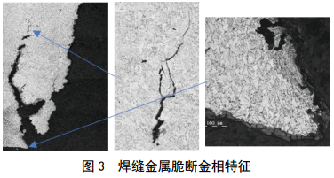裂紋起裂區(qū)域(打底焊)呈現(xiàn)局部塑性起裂;沿焊縫金屬的裂紋擴展均為脆性擴展,截面金相可見脆性二次裂紋(圖 3);內外壁及斷口均未發(fā)現(xiàn)明顯的腐蝕痕跡。