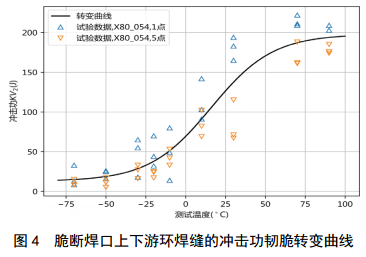 采用自保護藥芯焊絲的環(huán)焊縫主要表現(xiàn)為焊縫金屬沖擊韌性離散,有的位置沖擊吸收能量低。例如,X80管道環(huán)焊縫的打底焊多采用堿性焊條E7016手工焊工藝,填充/蓋面焊采用自保護藥芯焊絲E81T8-Ni2半自動焊工藝,其焊縫金屬﹣10 ℃沖擊吸收能量為15 J~150 J,韌脆轉變溫度較高(圖 4)。