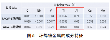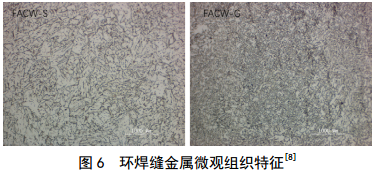 焊縫韌性低與其焊接工藝和微觀組織相關。一方面,我國目前在役干線管道大多選用藥芯焊絲自保護焊(FCAW-S)工藝,藥芯中含有較高的Al元素,在發(fā)揮脫氧保護作用的同時難免使過量的Al固溶在焊縫金屬內。例如,自保護藥芯焊縫中的Al含量是氣保護藥芯焊(FCAW-G)焊縫的15倍(圖 5)。 Al能夠促進C的擴散從而穩(wěn)定化奧氏體,進而在降溫過程中進入貝氏體轉變區(qū),使得焊縫微觀組織包含較多貝氏體。對比自保護藥芯焊接和氣保護藥芯焊接的環(huán)焊縫顯微組織可以發(fā)現(xiàn)(圖 6), Al含量高的焊縫,其貝氏體鐵素體的含量也較高。