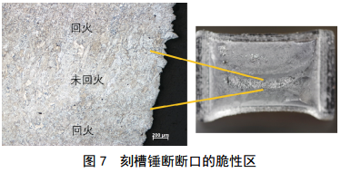 另一方面,焊接時如果單道熔敷金屬較厚,則后 一焊道不能對前一焊道充分回火,會有一定比例的未回火貝氏體鐵素體存在于焊縫金屬內。例如,焊縫金屬刻槽錘斷試驗斷口未見明顯焊接缺陷,但可見部分樣品存在不同程度的脆性區(qū)(圖 7),在該區(qū)域中可見粗大的貝氏體鐵素體,貝氏體板條間可見鏈狀M-A組元,這類組織具有較好的強度,但韌性偏低,是環(huán)焊縫脆斷的冶金因素。