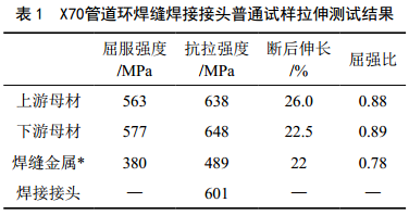 焊縫金屬的屈服強度低于母材的屈服強度,當管線承受軸向載荷的作用時,焊縫金屬將率先屈服并開始塑性變形,由于焊縫占管線的長度小且焊縫屈服強度低,管線的主要應變集中在焊縫內,在焊縫處發(fā)生應變集中。應變集中不同于應力集中,應力集中所產生的應力值上限為該處材料的屈服強度,其破壞形式主要表現(xiàn)為疲勞源;應變集中處應變值不受材料限制,其破壞形式主要表現(xiàn)為塑性剪切破壞或者脆性斷裂。