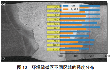 結果表明:在環(huán)焊縫內部,不同位置的屈服強度、抗拉強度不同,其分布規(guī)律與硬度存在明顯相關性,低硬度區(qū)的屈服強度與抗拉強度均低于其他區(qū)域,低硬度區(qū)可能是由于后一焊道對前一焊道的回火所致。所有小試樣拉伸的屈服強度均低于標準中對焊接接頭的屈服強度要求,焊接接頭屬于低強匹配接頭。