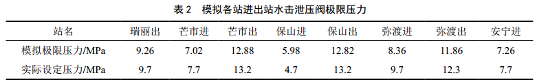 (2)基于表 1,研究各站的水擊泄壓閥壓力設定值。利用設定輸量的穩(wěn)態(tài)工況,依次關閉各站進出站泄壓閥,測試其水擊的極限壓力,得到各站進出站極限壓力(表 2)。