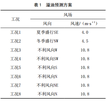 根據(jù)氣象條件,海底管道所在海域附近夏季盛行SE向風(fēng),冬季盛行NW向風(fēng),年主導(dǎo)風(fēng)向為SE向。按《船舶污染海洋環(huán)境風(fēng)險評價技術(shù)規(guī)范(試行)》要求,選取對主要敏感目標(biāo)最不利的風(fēng)向為不利風(fēng)向,風(fēng)速為相應(yīng)的年平均風(fēng)速。管道環(huán)境敏感區(qū)域位于管道北側(cè)、南側(cè)及東側(cè),油污對周邊的海洋保護區(qū)造成危害為不利情況,故根據(jù)溢油點和環(huán)境敏感區(qū)域位置,試算后選擇不同的不利風(fēng)向分別為W、 SW、 S和N向風(fēng)[3]。故本次預(yù)測主要考慮SE向風(fēng)、 NW向風(fēng),以及不利風(fēng)向W、 SW、 S和N向風(fēng),風(fēng)速取多年平均風(fēng)速,不利風(fēng)向時取最大不利風(fēng)速10.8 m/s。選擇高平潮時刻進行溢油預(yù)測,工況見表 1。