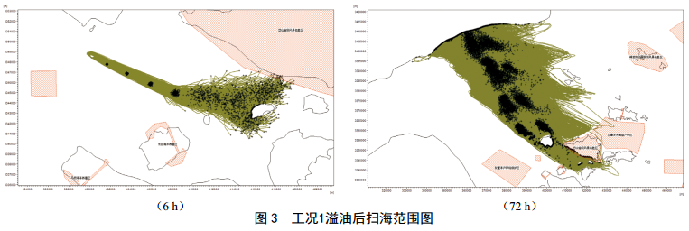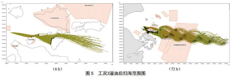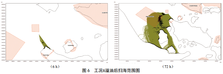 CB1發(fā)生溢油事故后,工況1(高平潮, SE風(fēng)向, 4.0 m/s風(fēng)速) 6 h掃海面積61.2 km2, 72 h后掃海面積為3 525.5 km2;工況3(高平潮, W風(fēng)向,10.8 m/s風(fēng)速) 6 h掃海面積195.7 km2, 72 h后掃海面積為8 026.8 km2(圖 5);工況4(高平潮, SW風(fēng)向, 10.8 m/s風(fēng)速) 6 h掃海面積93.8 km2, 72 h后掃海面積最大,為10 542.4 km2;工況6(高平潮, N風(fēng)向, 10.8 m/s風(fēng)速) 6 h掃海面積為8.2 km2, 72 h后掃海面積為759.5 km2(圖 6)。不同風(fēng)向?qū)Νh(huán)境敏感區(qū)域溢油的響應(yīng)時間各不相同,最快1 h溢油到達環(huán)境敏感目標(biāo)區(qū)域,主要敏感目標(biāo)中五峙山列島鳥類自然保護區(qū)受影響最嚴(yán)重。