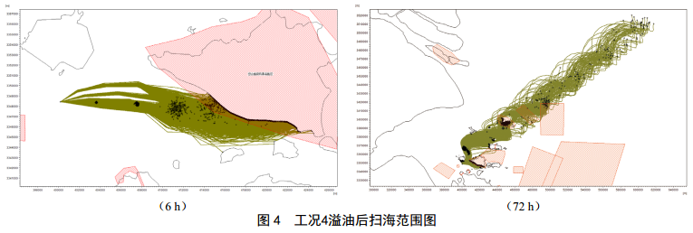 預(yù)測結(jié)果表明,由于周邊海島的阻隔作用,不同 風(fēng)向時溢油影響的差別較大。 YS2發(fā)生溢油事故時,工況1(高平潮, SE風(fēng)向, 4.0 m/s風(fēng)速) 6 h掃海面積為63.0 km2, 72 h后掃海面積為3 582.3 km2(圖 3);工況3(高平潮, W風(fēng)向, 10.8 m/s風(fēng)速) 6 h掃海面積為195.7 km2, 72 h后掃海面積為8 026.8 km2;工況4(高平潮, SW風(fēng)向, 10.8 m/s風(fēng)速) 6 h掃海面積為75.5 km2, 72 h后掃海面積最大,為12 983.2 km2(圖 4)。不同風(fēng)向?qū)Νh(huán)境敏感區(qū)域溢油響應(yīng)時間各不相同,最快2 h溢油到達環(huán)境敏感區(qū)域,岱山省級風(fēng)景名勝區(qū)受影響最嚴(yán)重。