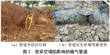 采空塌陷區(qū)內(nèi)的管道由于受到擠壓、拉拽,經(jīng)常出現(xiàn)位移、翹曲,嚴(yán)重時(shí)發(fā)生彎曲變形,管道本體出現(xiàn)褶皺變形(圖 2),嚴(yán)重時(shí)造成管道拉裂、爆炸、輸氣中斷等,影響居民生活和企業(yè)生產(chǎn)。如2018年1月,山西三晉天然氣長輸管道(長子縣-長治縣段)受采空區(qū)地表沉陷影響,造成管道局部地段應(yīng)力發(fā)生變化,管道被拉裂漏氣,導(dǎo)致長治市短時(shí)間內(nèi)供氣量減少32萬立方米。