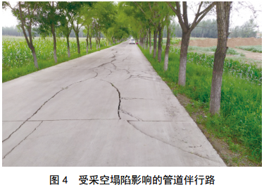 采空塌陷使輸氣管道工程的伴行路也出現(xiàn)拉張裂縫和錯(cuò)臺(tái),給進(jìn)行管道日常維護(hù)的車輛和人員通行造成困難(圖 4)。