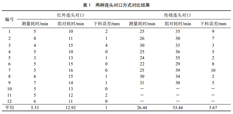 現(xiàn)場(chǎng)使用時(shí),首先將紅外連頭對(duì)口裝置安裝在兩段長(zhǎng)輸管道管口的圓心處,紅外線發(fā)射器與安裝在另一端管道的紅外線接收器相對(duì)。調(diào)整轉(zhuǎn)向球使紅外線直接照射在接收器上,固定紅外線發(fā)射器和接收器,使兩端管道管口圓心處在同一條直線上。分別在兩端管道使用弓型直角尺畫(huà)出切割標(biāo)記線,標(biāo)記線圍成的圓形平面與紅外線相垂直,測(cè)量?jī)蓚(gè)平面之間的距離,即得出下料長(zhǎng)度。該裝置經(jīng)揭陽(yáng)維搶修隊(duì)用于DN 800閩粵支干線工程和揭陽(yáng)分輸站改擴(kuò)建工程中,與傳統(tǒng)連頭對(duì)口測(cè)量方式對(duì)比(表 1),結(jié)果表明,使用該裝置能夠降低下料誤差,明顯縮短施工時(shí)間。