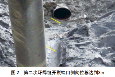 第二次事故發(fā)生于2018年1月(圖 2),再次開展了現(xiàn)場修復(fù)和技術(shù)研究工作。包括:①委托位于新加坡的DNV GL公司開展失效調(diào)查;②制定具有高應(yīng)變能力的焊接工藝規(guī)程;③確定能夠達到焊接高應(yīng)變能力焊縫的焊工資質(zhì)。