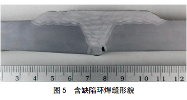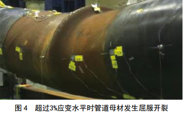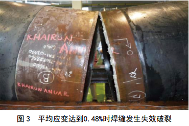 試驗二:采用具備高應(yīng)變能力的焊接工藝規(guī)程。根焊采用E7016-H4,熱焊、填充和蓋帽都采用E9045-P2 H4R,手工電弧焊堿性實心焊條。環(huán)焊縫機械性能測試報告顯示,拉伸強度613~670 MPa,符合API標準(570~760 MPa)規(guī)定。焊縫、熱影響區(qū)和母材的沖擊功分別為160 J、 281 J和298 J。試驗結(jié)果顯示:失效發(fā)生在母材位置,失效時的拉伸應(yīng)變大于3%(在根部預(yù)制了深2.9 mm、長190 mm、寬0.7 mm的缺陷,并伴有2 mm錯邊)。見圖 4、圖 5。