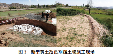 蘭州分公司在蘭鄭長(zhǎng)成品油管道K9+480米處以抗疏力改良黃土夯筑擋土墻,經(jīng)凍融和汛期考驗(yàn),未出現(xiàn)垮塌和沖刷現(xiàn)象,且植被恢復(fù)效果較佳(圖 2)。進(jìn)一步優(yōu)化方案后,在蘭成原油管道K47+900米處開(kāi)展了新型黃土改良劑擋土墻嘗試,表明其不影響農(nóng)作物生長(zhǎng),施工快捷,具有很好的推廣和應(yīng)用價(jià)值(圖 3)。